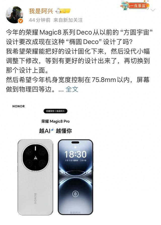 数码博主我是阿兴爆料,荣耀Magic8系列或将放弃沿用数代的“方圆宇宙”设计语言,改用全新的椭圆Deco镜头模组,机身宽度有望控制在73mm以内(较博主期待的75.8mm更激进),并实现物理四等边直屏。此外,新机Deco区域可能首次印刷专属影像标识,强化影像旗舰定位。